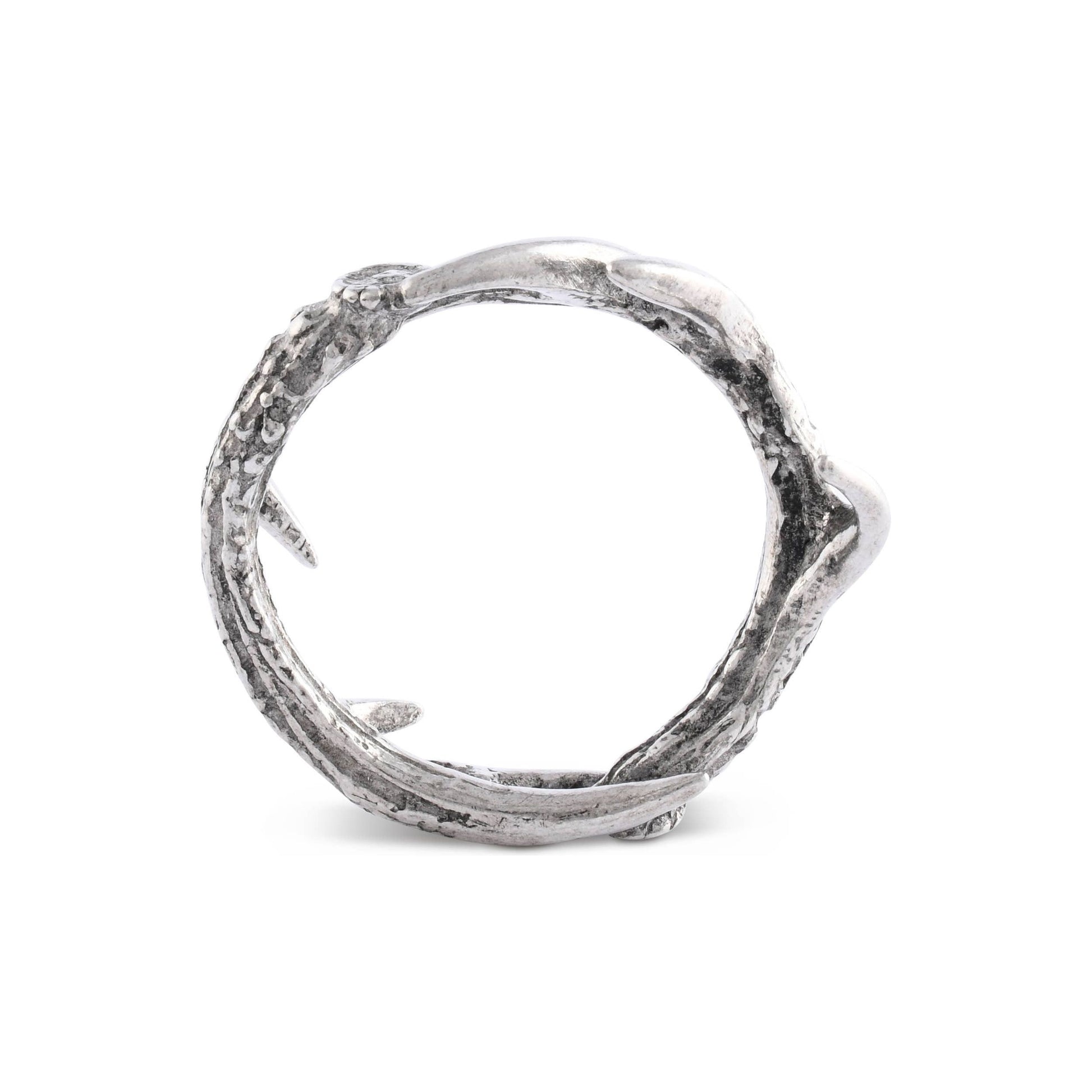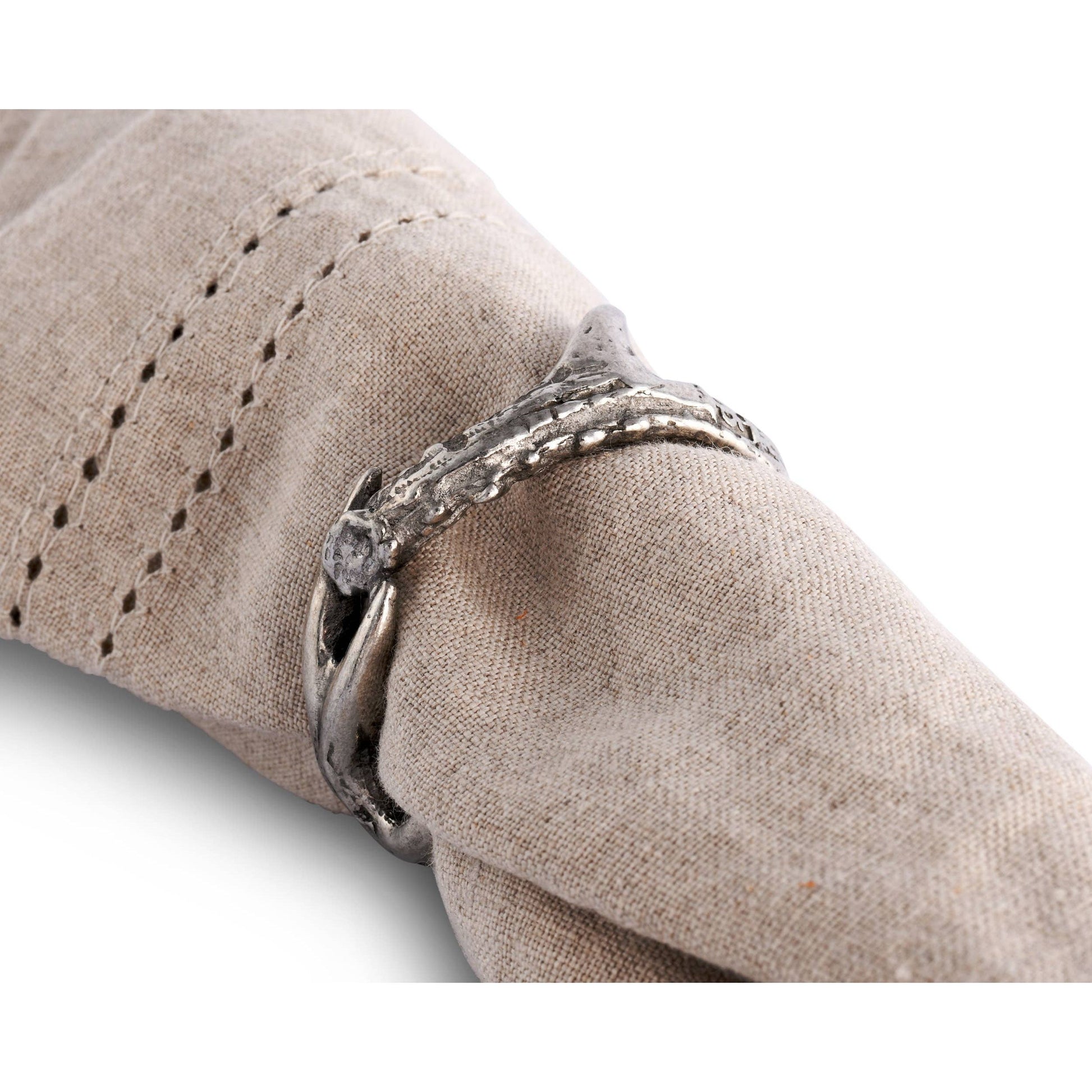Wrap up your napkins in lodge style antler napkin rings by Vagabond House. Fine pewter is hand-cast and finished as figural antler to create these unusual, realistic napkin rings. Light antiquing highlights details so real it seems as if the antler from tiny deer were used to make them. 6/5 Vagabond House’s Lodge Collection defines rustic and elegant, showcasing pieces inspired by the natural landscape surrounding lodges; whether they are for hunting, skiing or just the place you call home. Size: 1.5" L / 1.5" W / .75" T Care: Handcrafted solid lead free pewter never needs polishing Hand Wash and dry with soft cloth