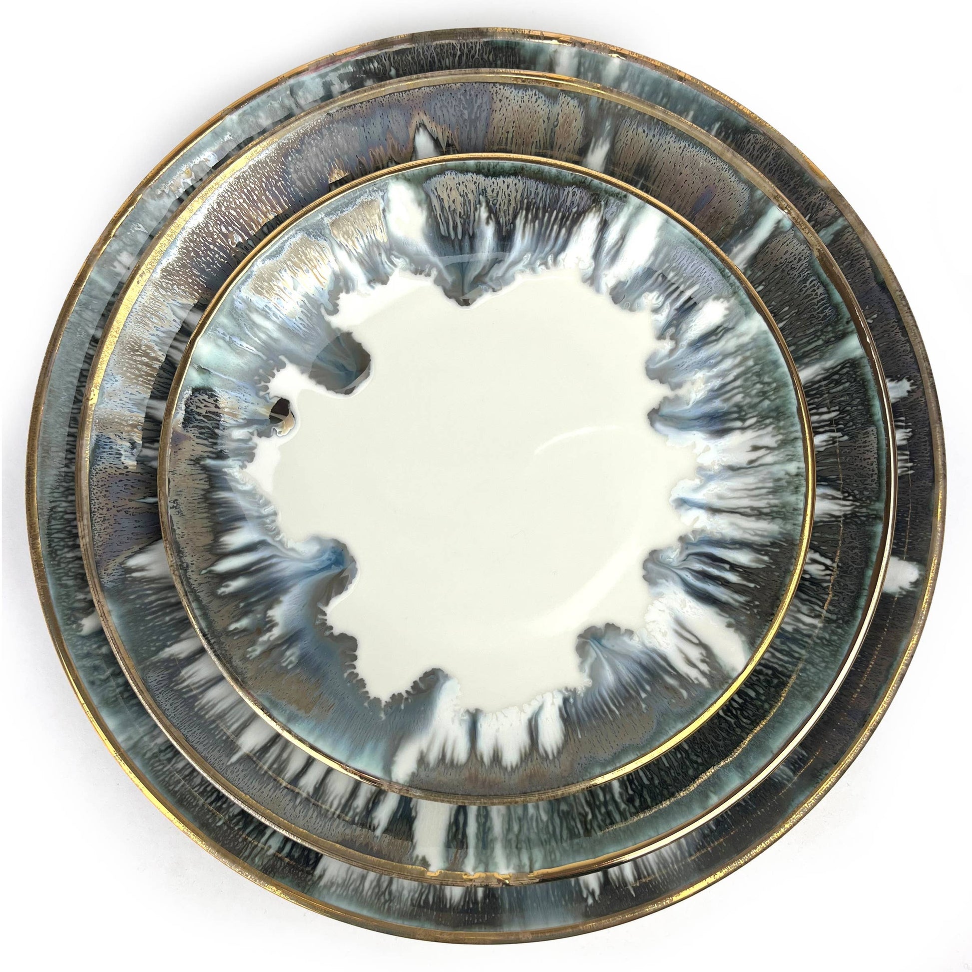 The Fjord collection is inspired by the landscapes formed between land and sea. Clear blue bodies of water combine with craggy cliffs and trees, translated in a glazing technique created by Michael.
