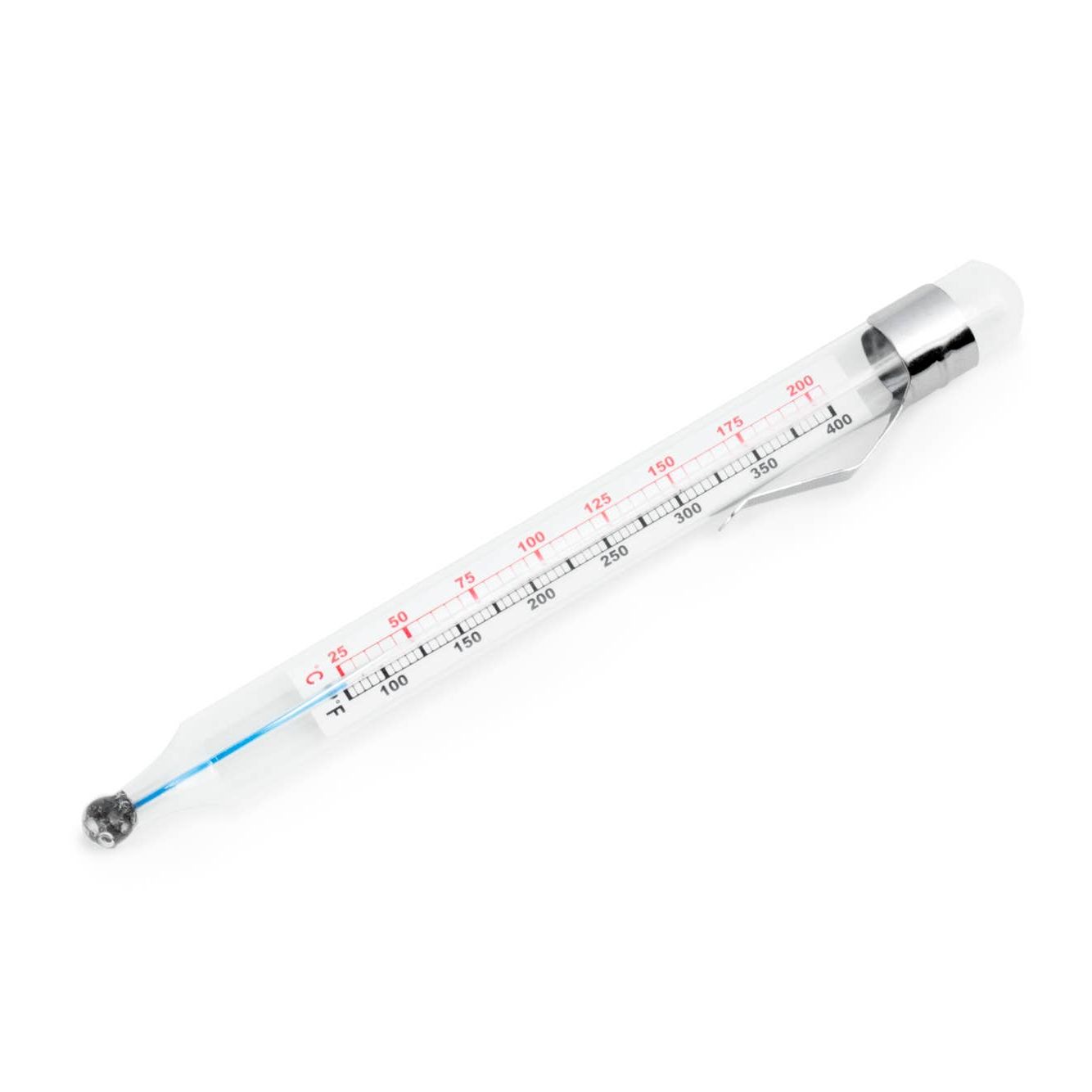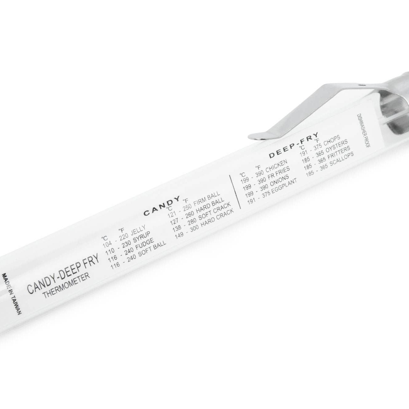 Essential for precise homemade candy-making, this glass Candy Thermometer features a convenient pot or pan clip that secures it above the pot’s hot base, allowing you to work hands-free while monitoring temperature. It measures temperatures from 100°F to 400°F, with Celsius readings included. Whether crafting soft ball, firm ball, hard ball, soft crack, or hard crack stages, this thermometer ensures accurate results for flawless candy, fudge, caramel, and other sweet confections.