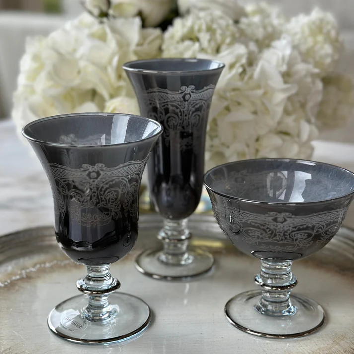 Named after Venice’s iconic market district, the Rialto Collection showcases the expert craftsmanship of Italian artisans. Each piece features mouth-blown white glass with a swirling marble effect crafted by Neapolitan glassmakers, then meticulously hand-painted in Tuscany. The Rialto Borghese line elevates these creations with a delicate Victorian etching, adding a refined and graceful touch to the glassware.
